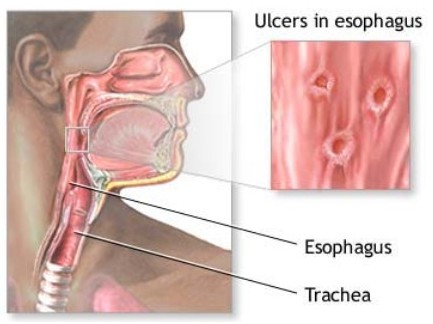 食道引起溃疡的发病率为2%~54%,食道柱状上皮受酸性消化液腐蚀后可以发生溃疡,出现类似胃溃疡的症状,疼痛可放射至背部,并可引起穿孔、出血、浸润、溃疡愈合后发生狭窄,出现下咽不畅的症状,甚至可穿透主动脉导致大出血而迅速致死。溃疡的病理分型有两种,最为常见的为发生在鳞状上皮段的浅表性溃疡,这种类型与因反流性食道炎引起的溃疡相似。另一种少见的为发生在柱状上皮段的深大溃疡,与消化性溃疡相似。